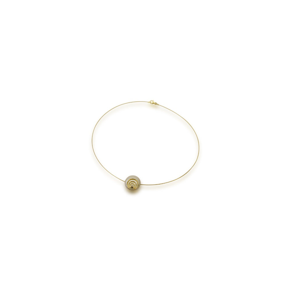 Round flat Biwa Pearl on 18ct white gold wire, with gold circles decorating the front of the pearl. Single 0.02ct Diamond also sits on the pearl. Hallmarked 18ct white gold