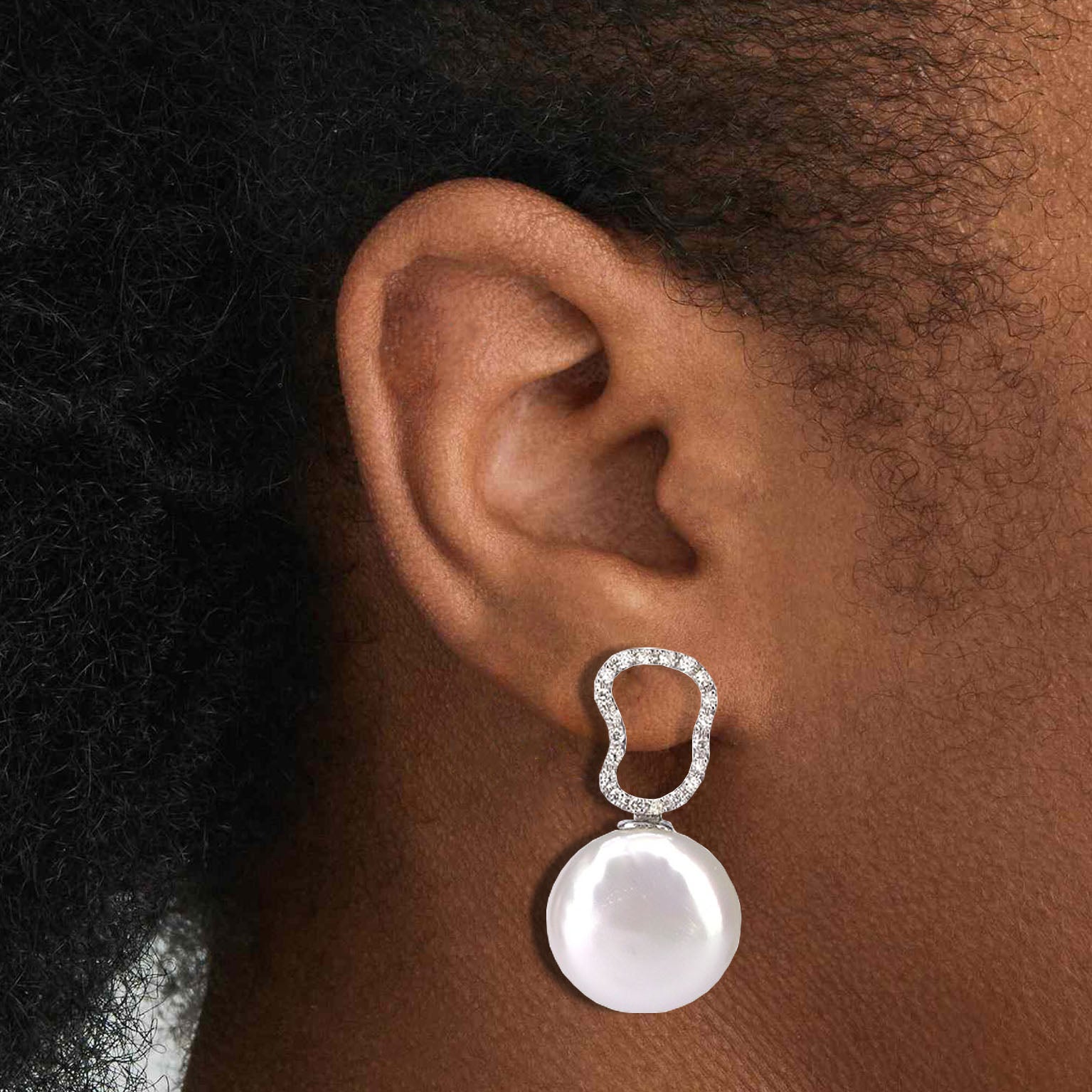 White Coin Pearls 0.29ct White Diamonds 18ct White Gold White Freshwater coin pearls with irregular shaped diamond hoops.
