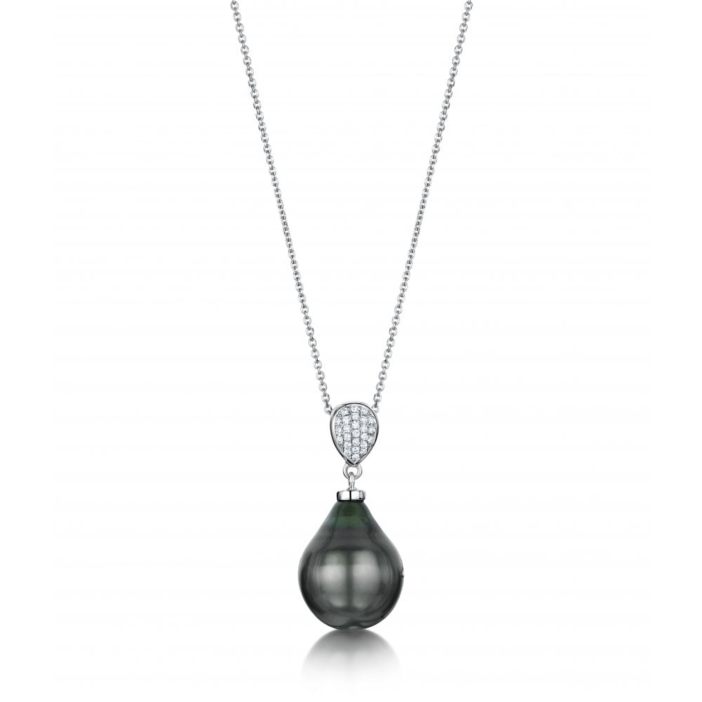 Tear drop shaped South Sea Grey Pearl measuring 14.1mm, suspended from 18ct white gold & diamond set bail with 0.12ct of diamonds. 18ct White gold chain. Hallmarked 750