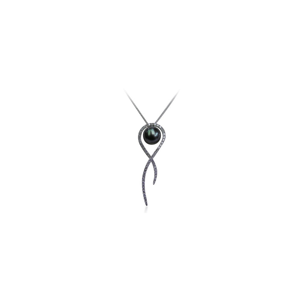 18ct white gold necklace by Yvel featuring a single 11mm grey Tahitian Pearl surrounded by round brilliant cut diamonds which follow the pearl & cross over underneath. Fixed on white gold chain.