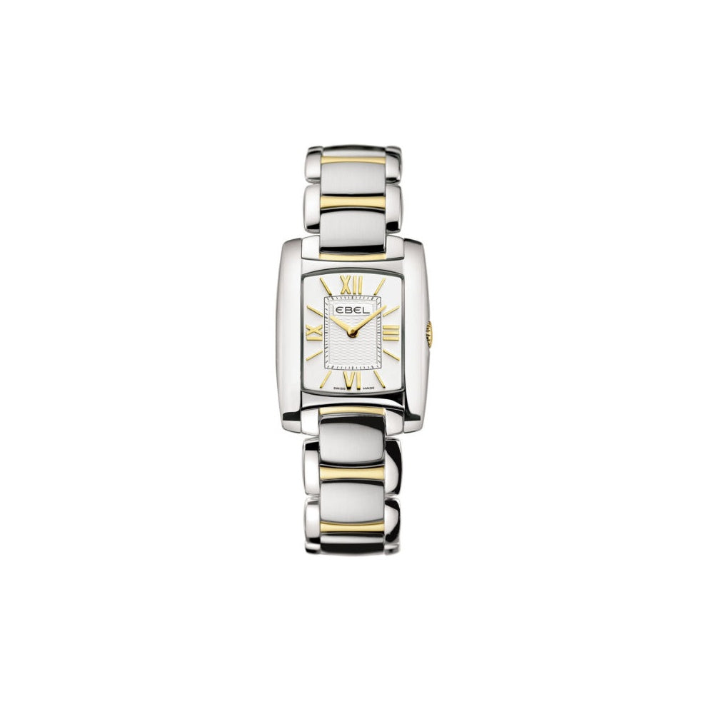 Women's EBEL Brasilia mini in stainless steel with 18ct yellow gold in bracelet in addition to gold batons & Roman numerals on dial. Scratch resistant Sapphire crystal glass. Water resistant to 50m. All EBEL watches come with a 3 year guarantee.