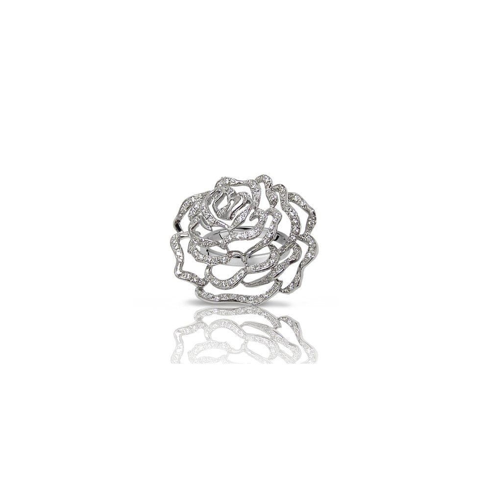 Large Rose flower ring in Sterling Silver with anti-tarnish treated rhodium plate: Finished to a high polish with pavé set cubic zirconia. Inspired by the classic English Rose, the Fei Liu Rose collection is a playful twist on classically feminine jewellery. Set with only the finest cut cubic zirconia, Rose is as versatile as it is wearable and will give any outfit a beautiful and luxurious finish.