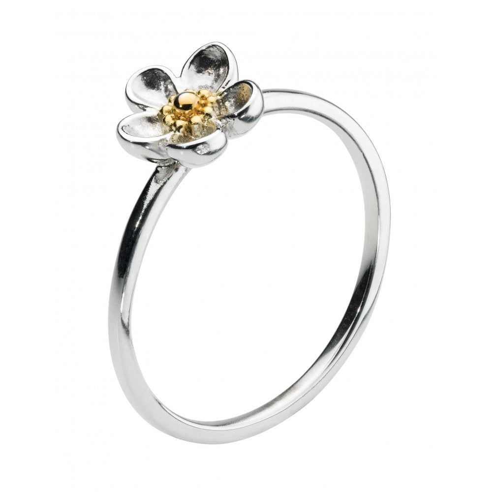 Sterling silver petals are highlighted with an 18 carat centre to create our Wood Rose Ring. Matching Jewellery available. Finger Size: N Height (cm): 0.8 Width (cm): 0.8 Metal Colour: Silver & Gold Weight: 1.6g